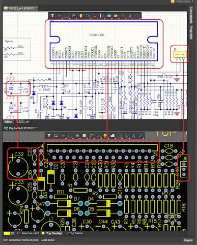 Figure 1. Schematic Optimized for Board Design and Component Placement on the Board The schematic symbol shape for a 32-pin IC (the main component) is created resembling the actual shape. Since bypass capacitors should be placed near the power pins, they are placed near the power pins in the schematic. Similarly, different functional blocks should not be split across one sheet in the schematic; instead, sheets should be divided per functional block. If the same circuit is used repeatedly, use sheet symbols, device sheets, and multi-channel design to replicate the circuit, rather than simple copy-paste. This allows for efficient use of the room feature. Utilizing Rooms When using 'Update PCB Document...' to transfer data to the PCB, the footprints are called in, and connections between the widest pins are displayed. A rectangular outline is displayed in the background. This rectangular outline is a Room; components are grouped into rooms per schematic sheet. Since you can move groups using these Rooms, it's beneficial to use Rooms for rough component arrangement.