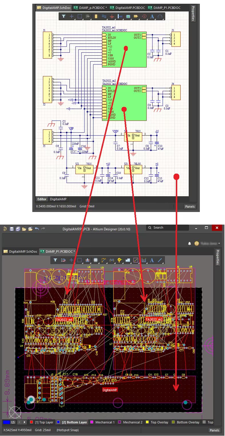 Figure 7. Repositioning Components Within Rooms Placement is finalized by repositioning the components assigned to each Room. This is less troublesome as you only need to select components within a Room and move them inside it. There's no confusion with other channels. Commands for Using Rooms If default settings are kept, Rooms are automatically created when circuit data is read into the PCB. They are then used for rough positioning during movement or rotation. This can be done using mouse drag or shortcuts, similar to placing individual footprints. Additionally, Rooms have their own editing commands under [Design] - [Rooms]. Commands like [Tools] - [Component Placement] - [Arrange Within Room] are also provided for placement and routing per Room. Using Shortcuts and Cross-Probing Component placement involves repeatedly moving components with the mouse and rotating them using the [SPACE] key. While most placement can be done this way, using shortcuts can speed up the work. For example, to select a specific component, you can use the shortcut [J], [C] to jump the cursor to the coordinates of that component. You can also use [J], [L] to jump the cursor to specified coordinate values. Then, after initiating the [Edit] - [Move] - [Component] command, you can place components by repeating [J], [C] and [J], [L] operations using only the keyboard. This method is particularly useful when you have a large number of component positions. Furthermore, the cross-probe feature is useful when placing components while referencing the schematic. < |