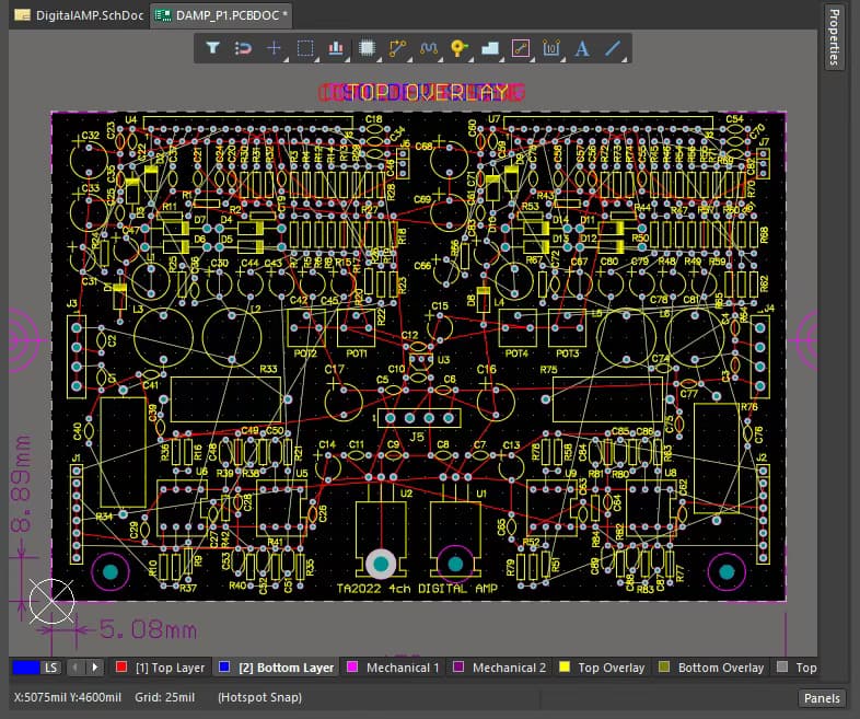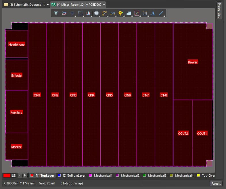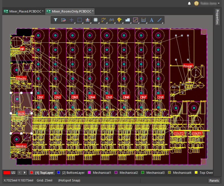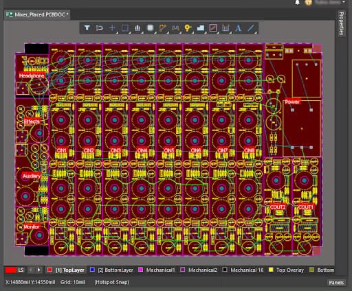 Figure 3. Completed Component Placement Individual components (footprints) are moved to place them in their correct positions. This diagram shows the completed layout. Components are grouped by functional block, making it easy to select the required parts. Also, although the same circuit is listed on two channels, they are separated in different Rooms, preventing confusion. Furthermore, this Room feature is especially useful when the basic layout is fixed and many circuits are repeated, such as in mixers.Below is an example of an audio mixer with a multi-channel design. The position of parts placed on the mixer board depends almost entirely on the product specifications. Therefore, using Rooms to assign parts to specified areas can significantly improve work efficiency.