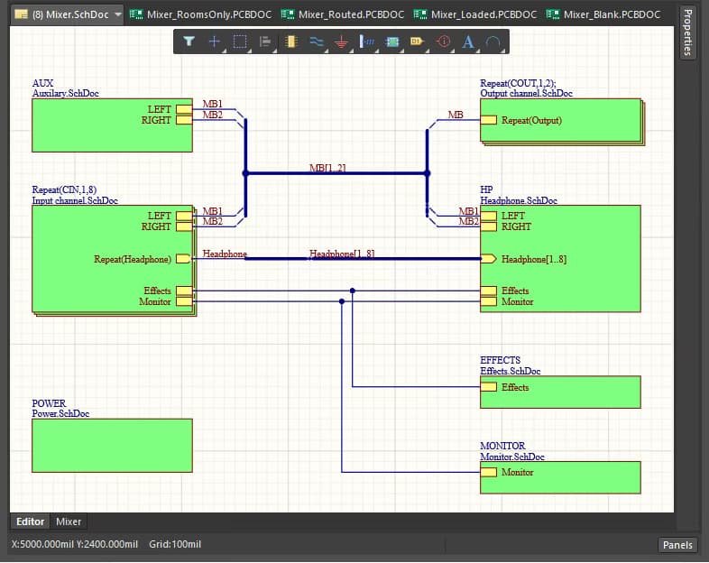 Figure 4. Audio Mixer Parent Schematic The parent schematic provides a child schematic for each functional block, with seven sheet symbols indicating them. However, due to the multi-channel design, the actual number of Rooms equals 15. If data is transferred from here to the PCB, 15 Rooms will be created.
